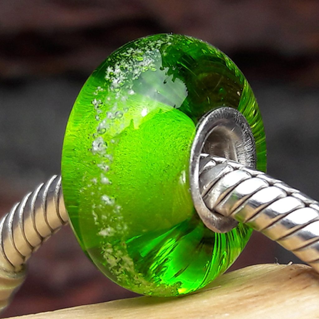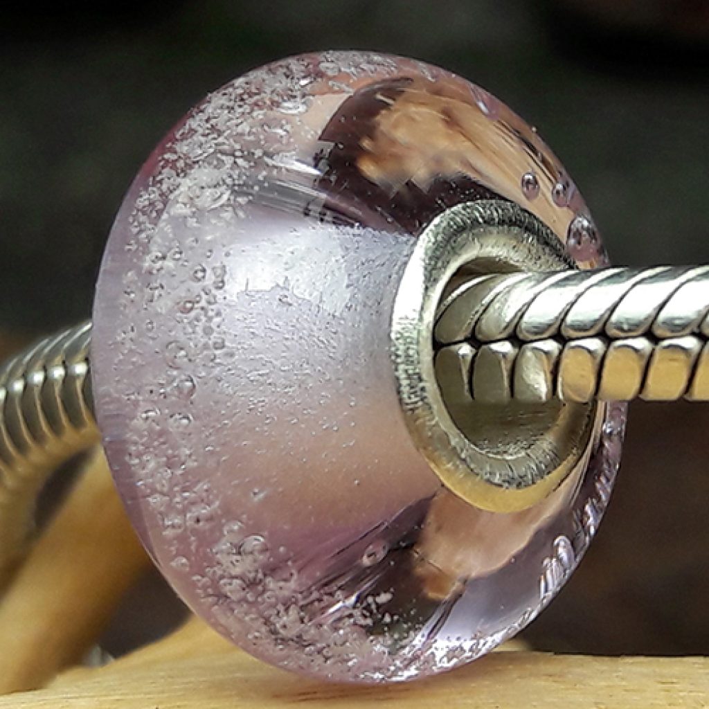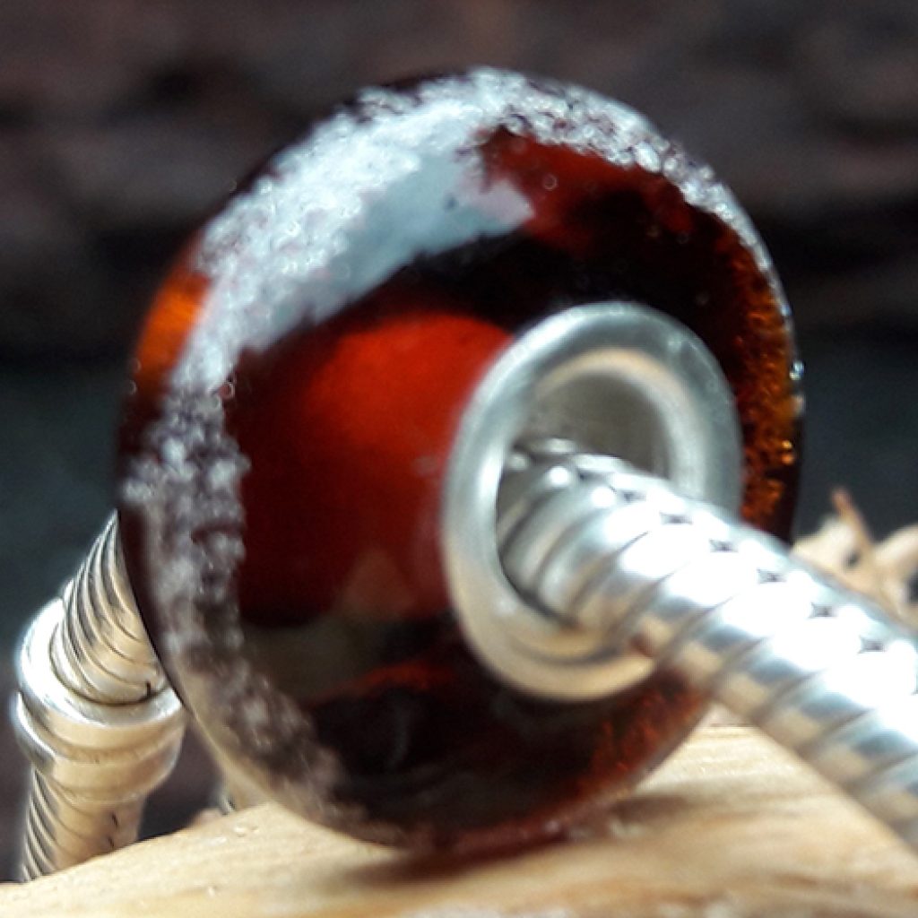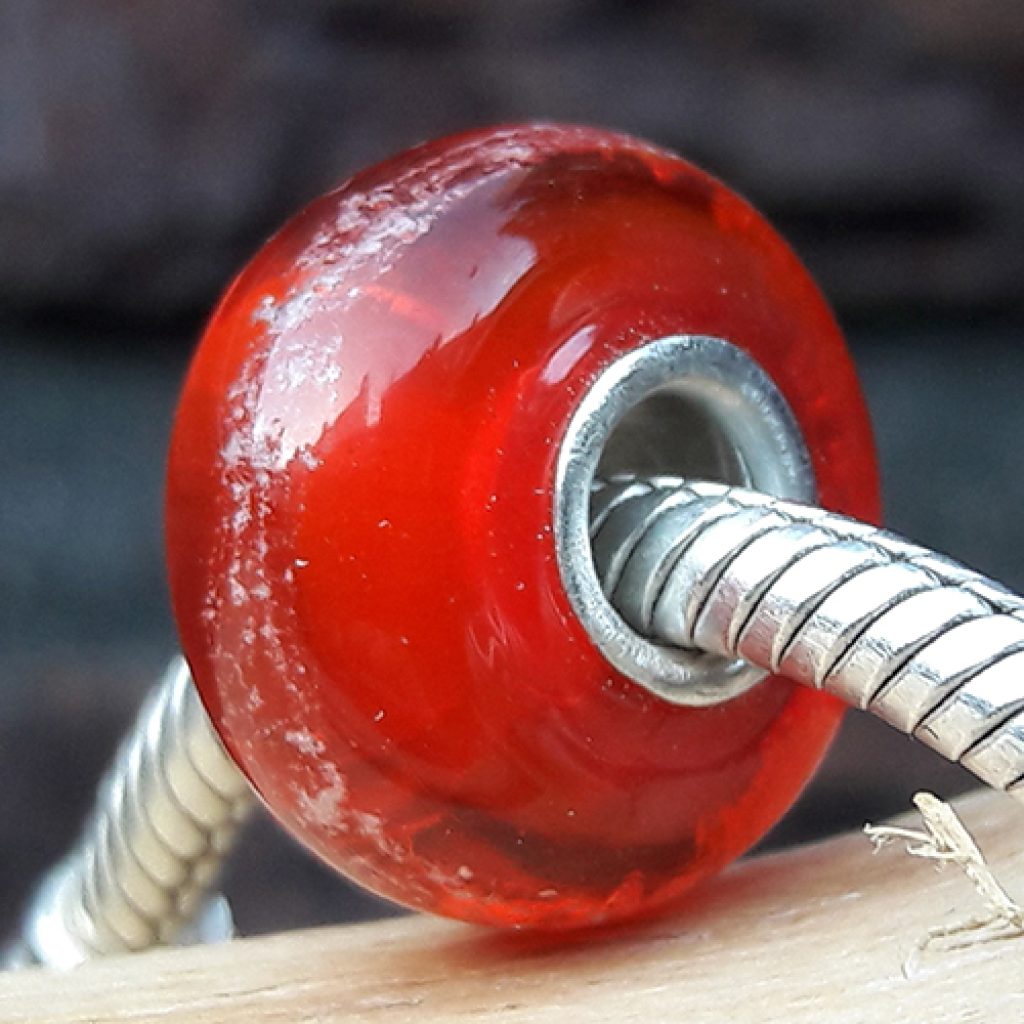De afmeting van de glasbedel is ca. 15 x 8 mm, en de doorsnede van het kraalgat is ca. 5 mm. De glasbedel wordt standaard voorzien van een sterling zilveren kern. De zilveren kern zorgt ervoor dat de armband of ketting niet beschadigd door de glasbedel.