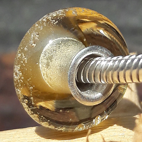 De afmeting van de glasbedel is ca. 15 x 8 mm, en de doorsnede van het kraalgat is ca. 5 mm. De glasbedel wordt standaard voorzien van een sterling zilveren kern. De zilveren kern zorgt ervoor dat de armband of ketting niet beschadigd door de glasbedel.